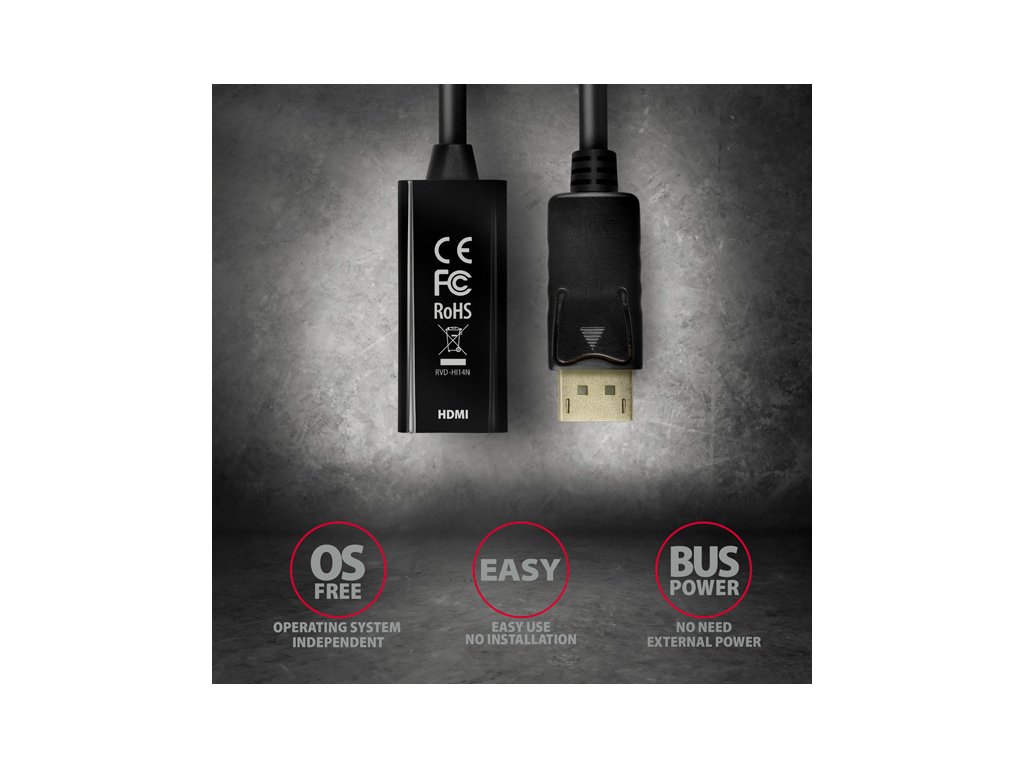 DisplayPort -> HDMI aktivní adaptér AXAGON RVD-HI14N pro připojení HDMI monitoru/TV/projektoru k počítači s výstupem DisplayPort.Šikovný malý hardwarový převodník bez potřeby jakékoliv instalace či nastavování zajistí kvalitní přenos obrazu i zvuku až do rozlišení 4K/30Hz.
