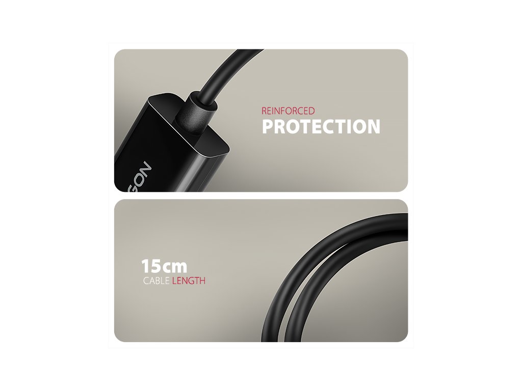 Redukce je vyrobena z kvalitních materiálů, které zajišťují vysokou spolehlivost. Kabel i konektory jsou chráněny proti zalomení, což prodlužuje jejich životnost. Adaptér navíc disponuje 15cm flexibilním kabelem pro snadnější manipulaci.