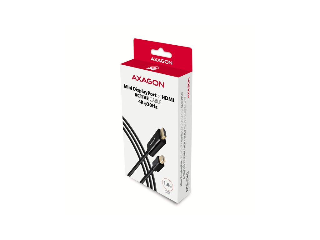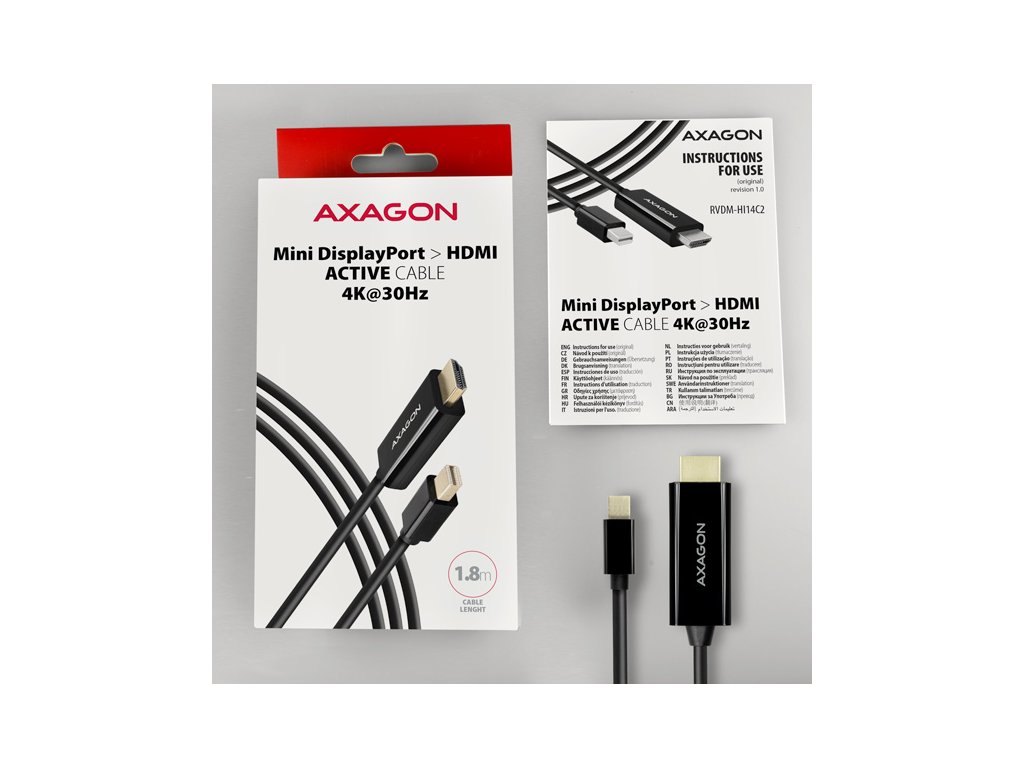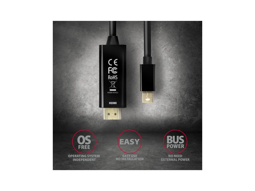 Mini DisplayPort -> HDMI aktivní kabel - redukce AXAGON RVDM-HI14C2 pro připojení HDMI monitoru/TV/projektoru k počítači s výstupem Mini DisplayPort.Šikovný malý hardwarový převodník bez potřeby jakékoliv instalace či nastavování zajistí kvalitní přenos obrazu i zvuku až do rozlišení 4K/30Hz.