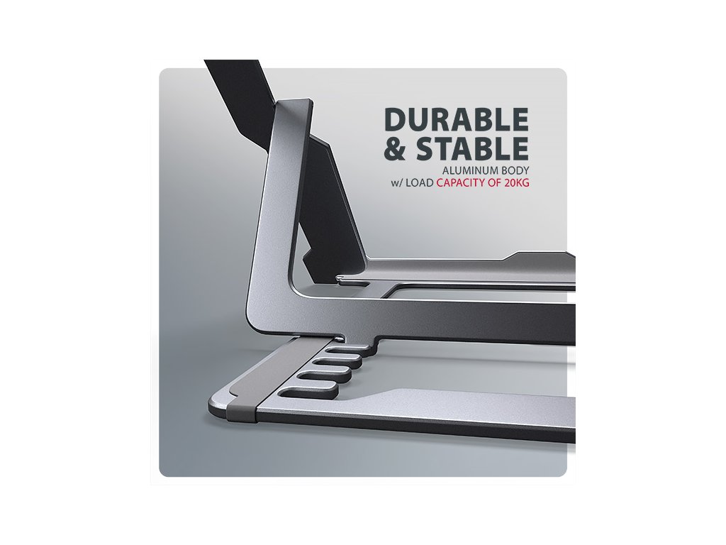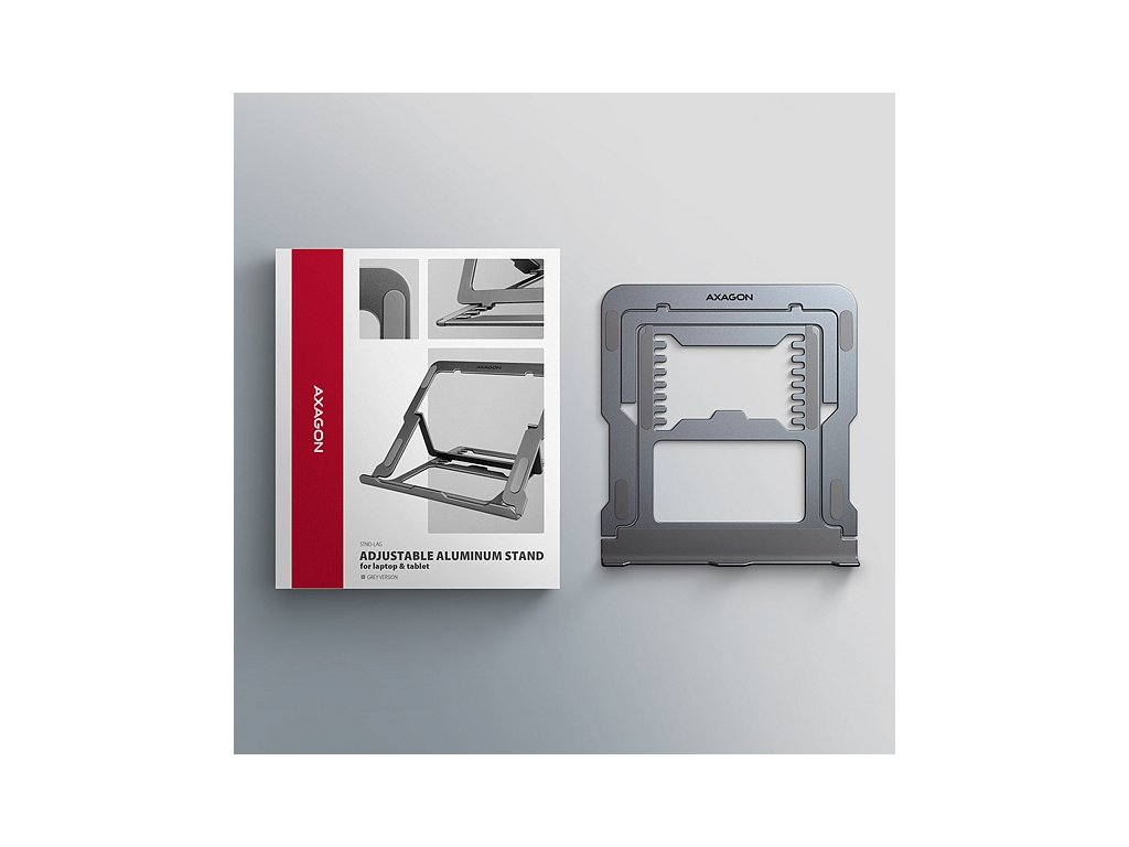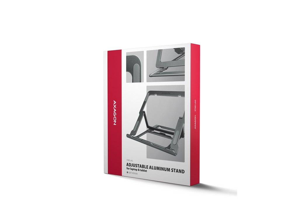 AXAGON STND-LAG je stojan na notebook či tablet, který zajišťuje pohodlí a zlepšuje ergonomii při práci. Je ideální pro zařízení s úhlopříčkou od 10" do 17.3" a umožňuje nastavení až osmi poloh. Snadno tak najdete ideální sklon stojanu pro maximální uvolnění vašich krčních a zádových svalů. Užijte si komfortní pracovní prostředí s kompaktním a přenosným stojanem, který se dokonale přizpůsobí vašim potřebám, ať už pracujete doma, v kanceláři, nebo na cestách.Podstavec je vyroben z hliníkových odlitků garantujících dlouhou životnost a spolehlivost. Díky protiskluzové úpravě se nemusíte obávat nežádoucích pohybů – vaše zařízení zůstane pevně na svém místě, a to bez poškození povrchu notebooku či podložky. Tyto pečlivě navržené vlastnosti zaručují perfektní stabilitu pro váš notebook, tablet nebo dokonce oblíbenou knihu, což vám poskytne klid a pohodlí při každodenním používání.