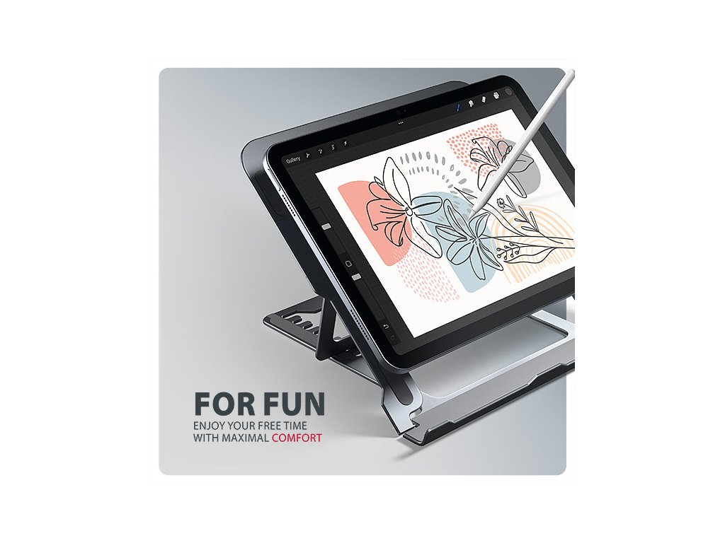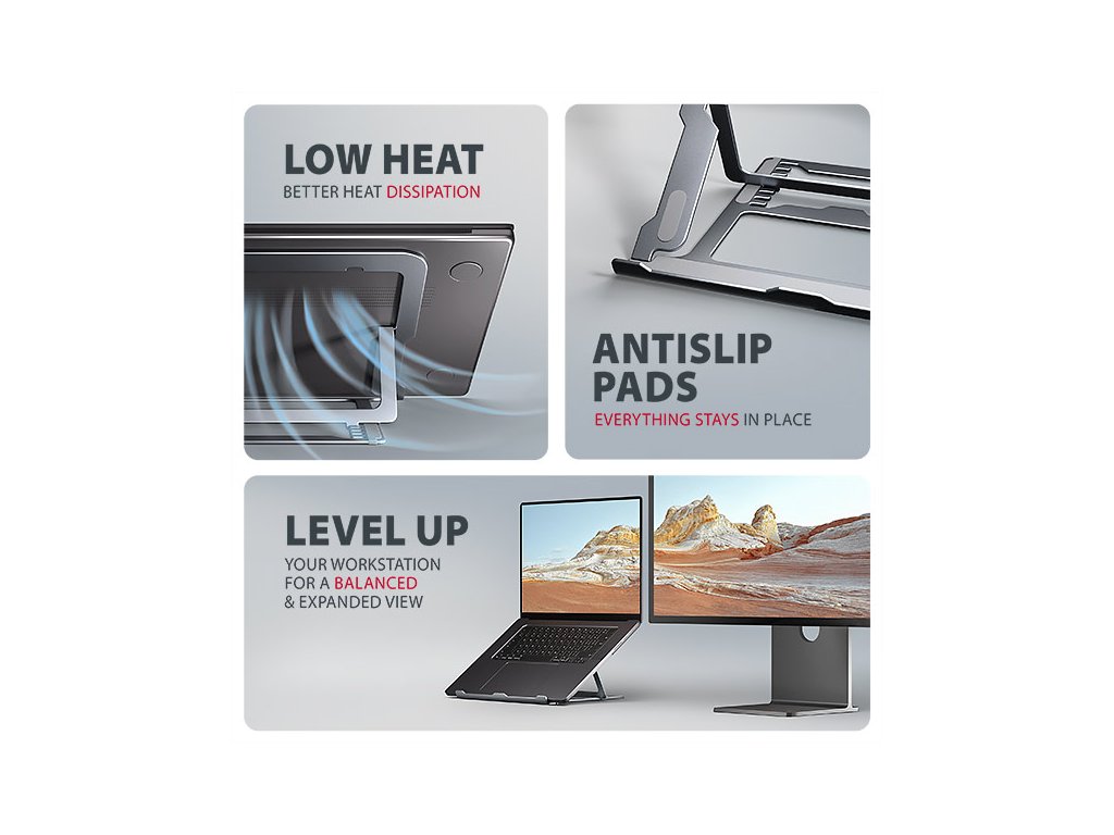 Stojan lze snadno složit do kompaktních rozměrů, což umožňuje pohodlné přenášení kamkoli potřebujete. Jeho elegantní design v šedé barvě nejen stylově doplní váš pracovní stůl, ale také přináší praktické funkce, které oceníte při každodenním používání.