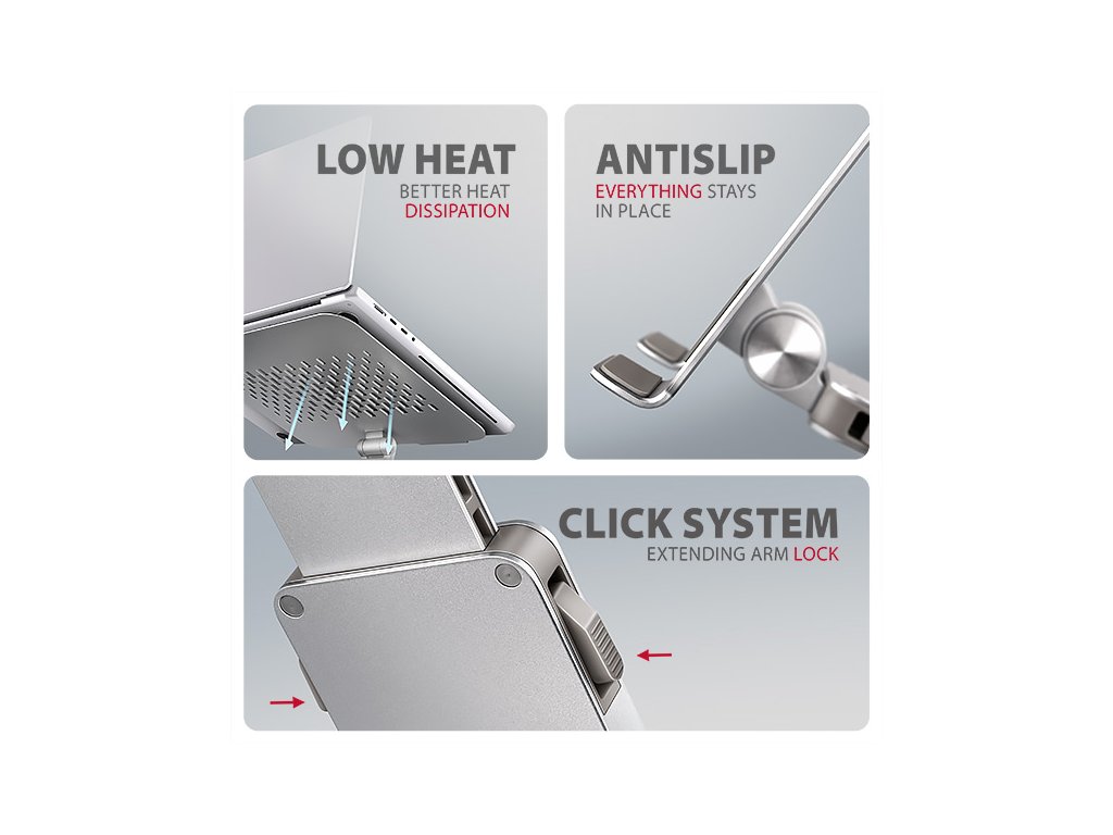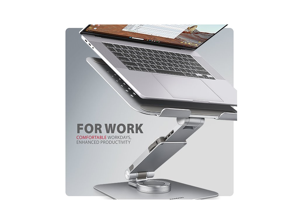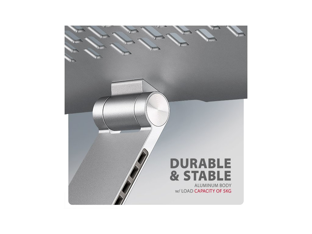 Podstavec pro notebook je vyroben z robustních hliníkových odlitků garantujících dlouhou životnost a spolehlivost. Díky protiskluzové úpravě zůstane vaše zařízení bezpečně na svém místě bez rizika nechtěných pohybů, aniž by došlo k jakémukoliv poškození povrchu notebooku nebo podložky. Tyto pečlivě navržené vlastnosti zaručují perfektní stabilitu pro váš notebook, tablet nebo oblíbenou knihu, což vám poskytne klid a pohodlí při každodenním používání.