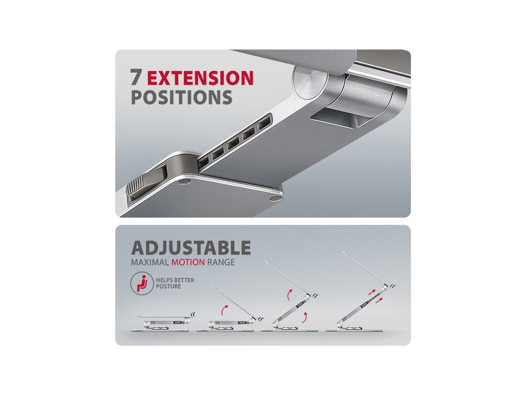 Unikátní funkcí je výsuvné rameno s pojistkou proti uvolnění, které umožňuje jeho prodloužení až o 6 cm díky sedmi nastavitelným pozicím. Tímto způsobem snadno nastavíte notebook do optimální výšky a vzdálenosti od vašich očí přesně podle vašich potřeb. Chytré řešení s dvojitým kloubem poskytuje plynulé nastavení výšky obrazovky tak, aby byla v jedné rovině s vaším externím monitorem. Tím získáte další pracovní plochu ve správné úrovni očí, což výrazně zlepšuje ergonomii, zvyšuje pohodlí a zároveň podporuje vaši produktivitu.