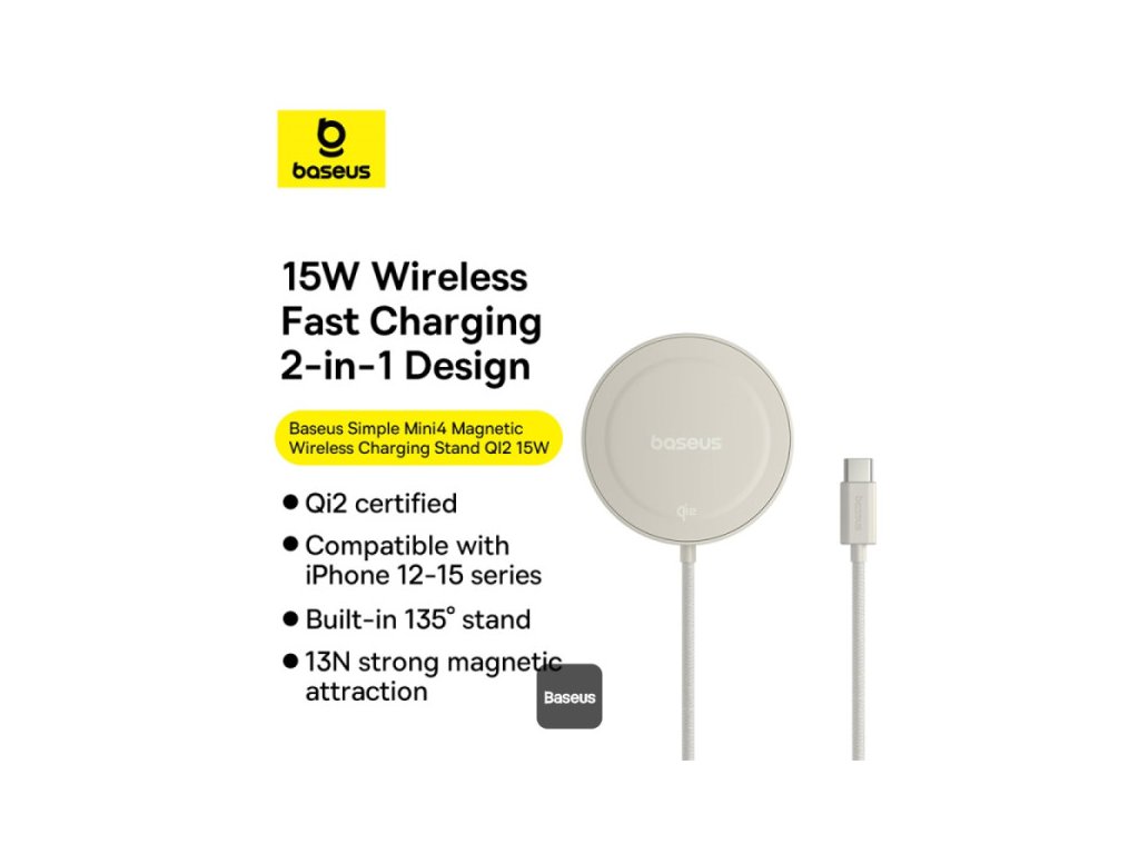 Baseus Simple Mini4 Magnetic Qi2 15W bezdrátový nabíjecí stojan – 135° nastavitelný pomocí vestavěného 1M kabelu typu – C – titanově zlatý