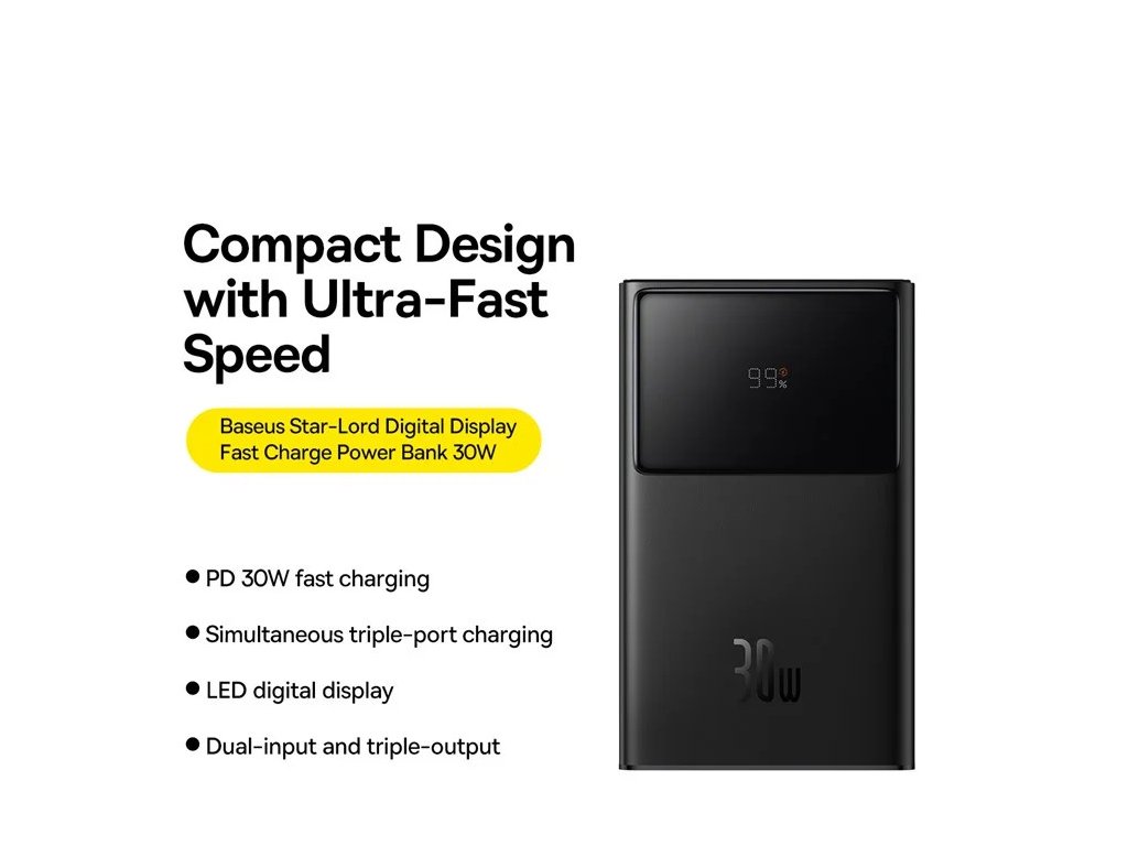 BASEUS Star-Lord Digital Display Fast Charging Power Bank 10000mAh 30W přenosná nabíječka telefonu – černá*Rychlé nabíjení 30W PD: Kompatibilní s vysokonapěťovým rychlým nabíjením Huawei 10V/2,25A 22,5W a je certifikováno protokoly rychlého nabíjení QC, PD, SCP, FCP, AFC a dalšími, rychlé nabíjení pro Xiaomi, pro Samsung, pro telefony Huawei a další
