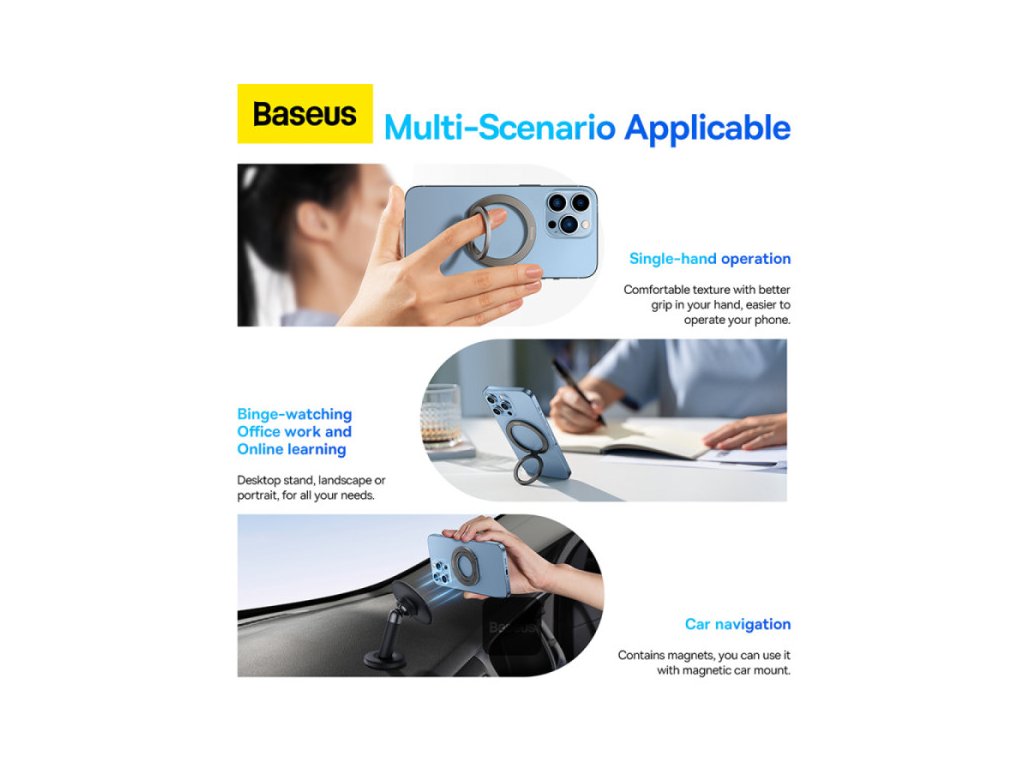 Magnetický (MagSafe) kroužek s prstýnkemUniverzální příslušenství známé a uznávané značky Baseus se bude hodit každému uživateli chytrého telefonu, který má MagSafe. Lehký a kompaktní magnetický držák umožňuje pohodlné používání zařízení za všech podmínek - stačí držák rozložit.