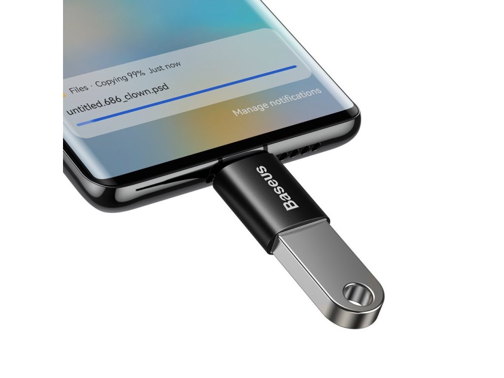 Malý adaptér z konektoru USB na USB typu C, vyrobený společností Baseus.