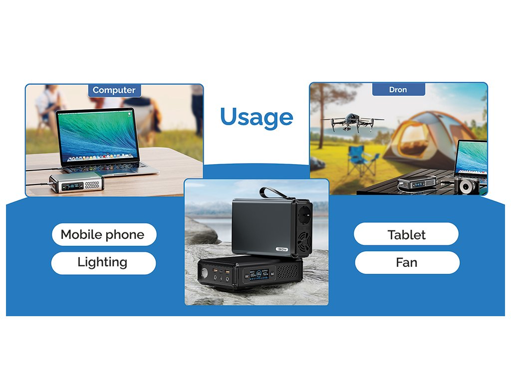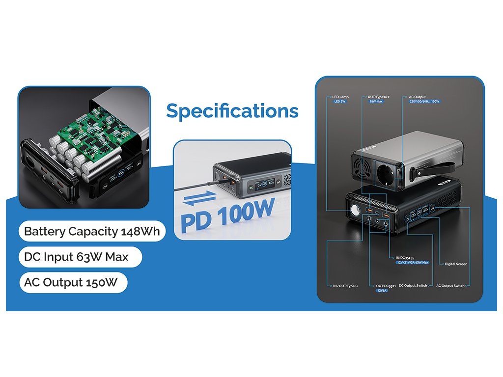 *Univerzální použití díky různým výstupům (USB-C, USB-A, DC jack 5521, AC230V)