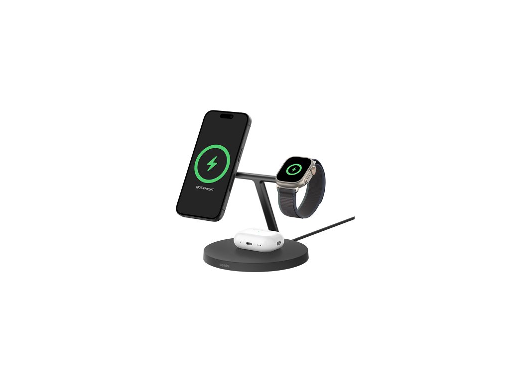 Bezdrátový nabíjecí stojánek Belkin BoostCharge Pro 3 v 1 s Qi2 15WBelkin WIZ032 podporuje rychlé nabíjení iPhonů, které podporují MagSafe® a Qi2