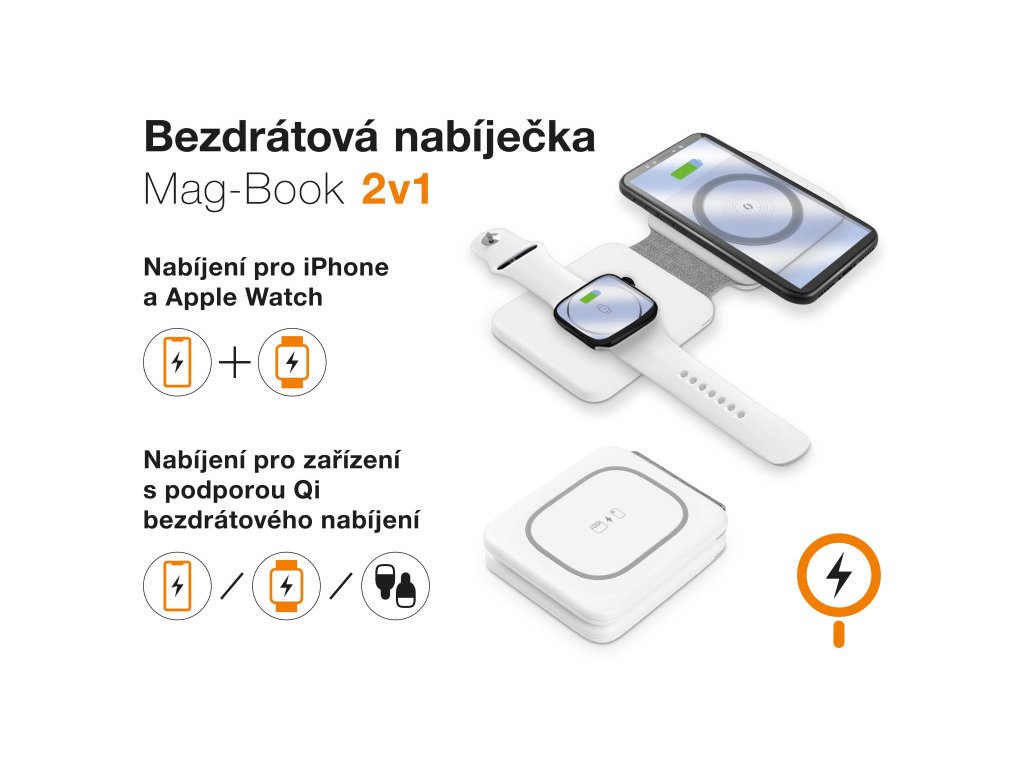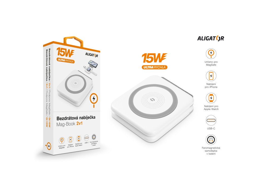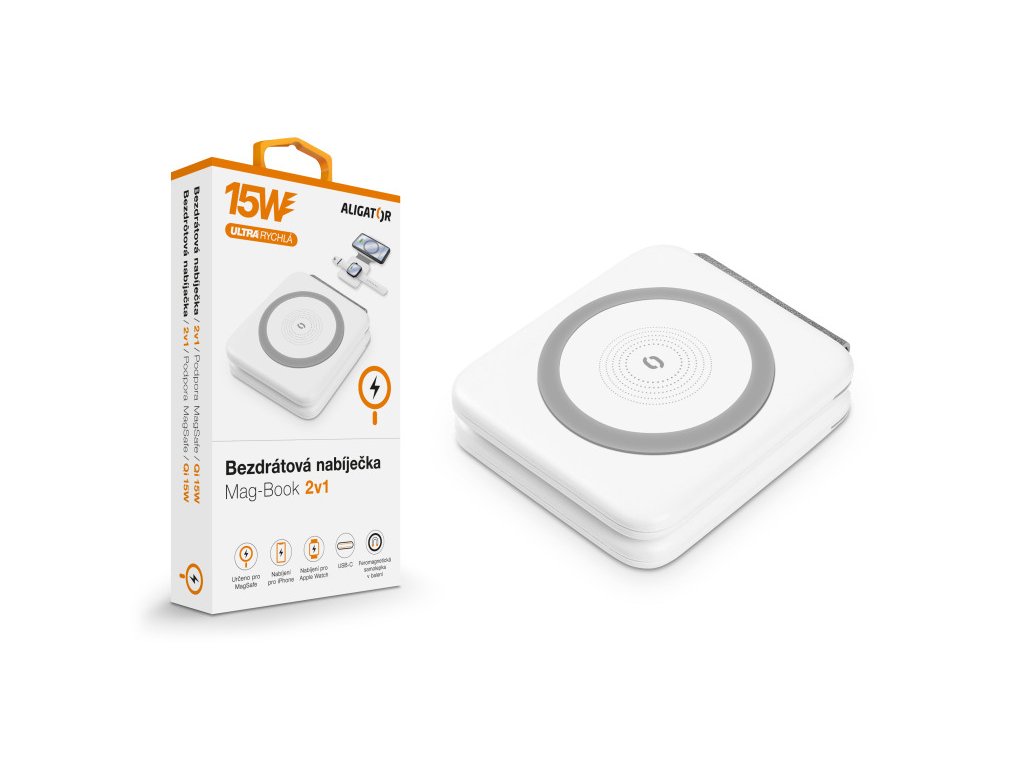 Bezdrátová nabíječka ALIGATOR Mag-Book 2v1, určeno pro MagSafe a nabíjení Apple Watch, 15W, bílá
