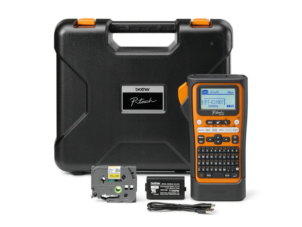 Obsah balení: Tiskárna štítků PT-E310BT, Li-Ion dobíjecí akumulátor, USB kabel type C (1m, černý), 1x 18 mm extrémně přilnavá páska s černým tiskem na žlutém podkladu, dokumentace, pouzdro