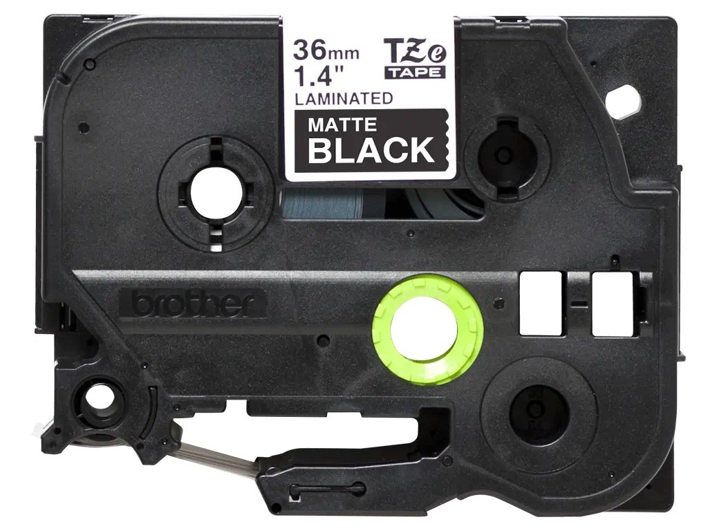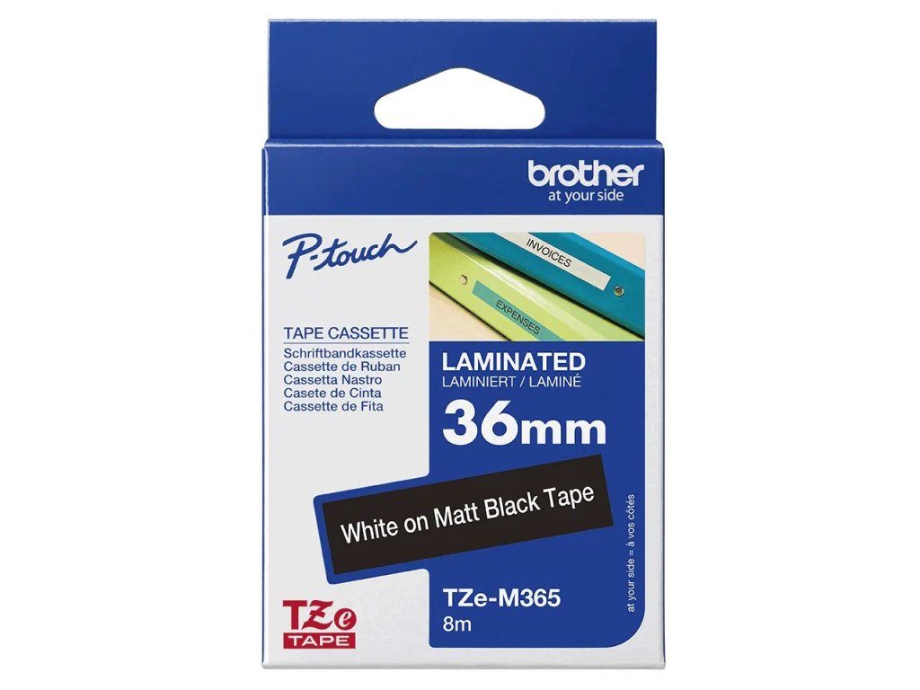 Originální pásková kazeta pro tisk štítků Brother TZe-M365 – matná laminovaná páska, bílý tisk na matném černém podkladu, šířka 36 mmBrother TZe-M365 matná laminovaná páska, bílý tisk na matném černém podkladu – šířka 36 mm
