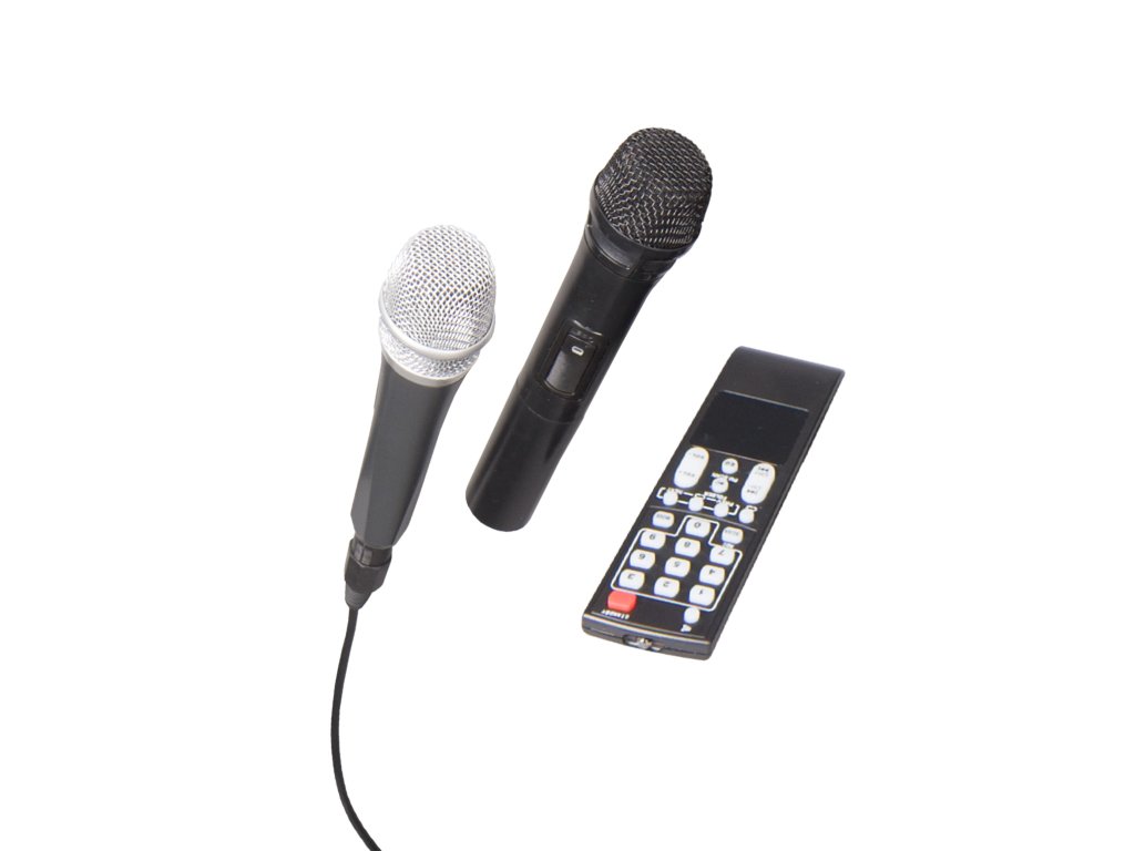 * V balení najdete - drátový i bezdrátový mikrofon, dálkový ovladač a napájecí kabel