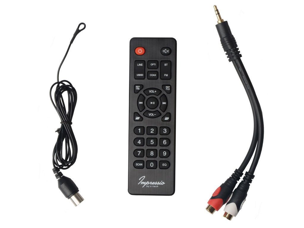 V pohodlí Vašeho obývacího pokoje asi nebudete sedět přímo u reproduktoru, proto budete častěji k jeho ovládání používat dodaný dálkový ovladač. Ten zvládne většinu funkcí, jako je: upravení hlasitosti, volba skladby nebo FM stanice, spuštění a přerušení přehrávání, nebo volbu zdroje zvuku mezi Bluetooth, FM rádiem, pamětí USB, nebo SD kartou a LINE-IN vstupem, optickým a koaxiálním vstupem.