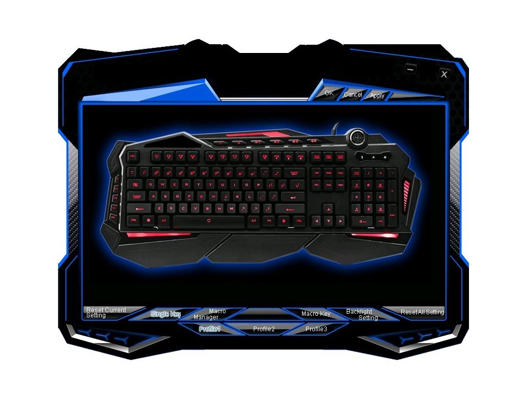 3 profily - na klávesnici naleznete klávesy pro přepínání mezi 3 nezávislými profily. Pro každý profil lze individuálně nastavit barva podsvícení, její intenzita, makra, předefinované klávesy...