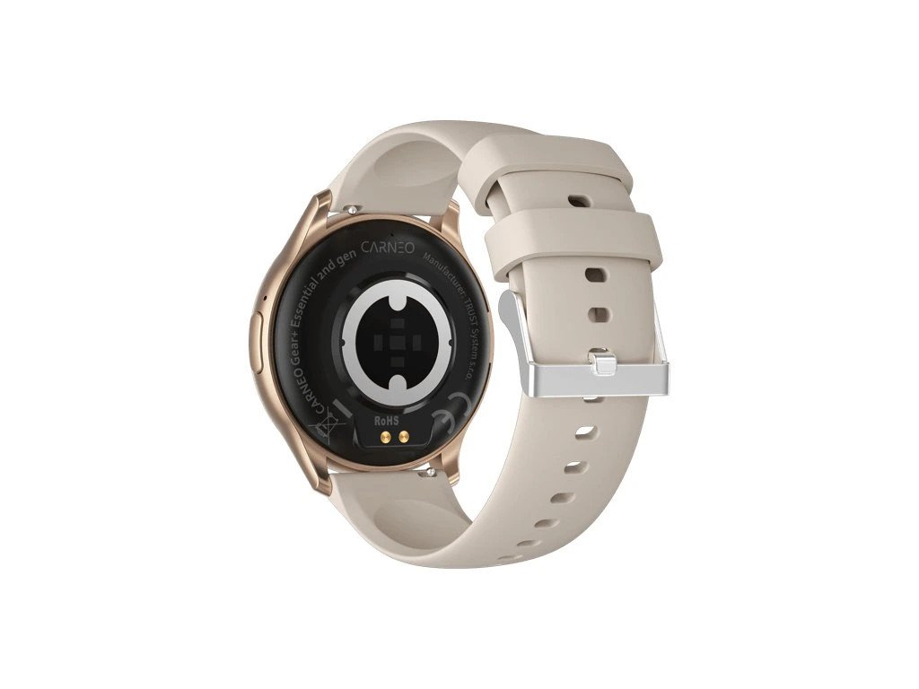 Chytré hodinky Carneo Gear+ Essential 2nd gen.Moderní, fitness hodinky CARNEO Gear Essential druhé generace ve zlaté barvě s béžovým na dotek velmi příjemným silikonovým řemínkem a barevným SUPER AMOLED displejem s vysokým jasem a funkcí trvalého zobrazení času. Monitorují vaši denní aktivitu, úroveň stresu a lze je spárovat s mobilním telefonem a upozornit Vás na příchozí hovor nebo SMS. Hodinky umožňují telefonovat, aniž byste vytáhli telefon z tašky s vestavěným mikrofonem a reproduktorem až do vzdálenosti 10 m od telefonu.