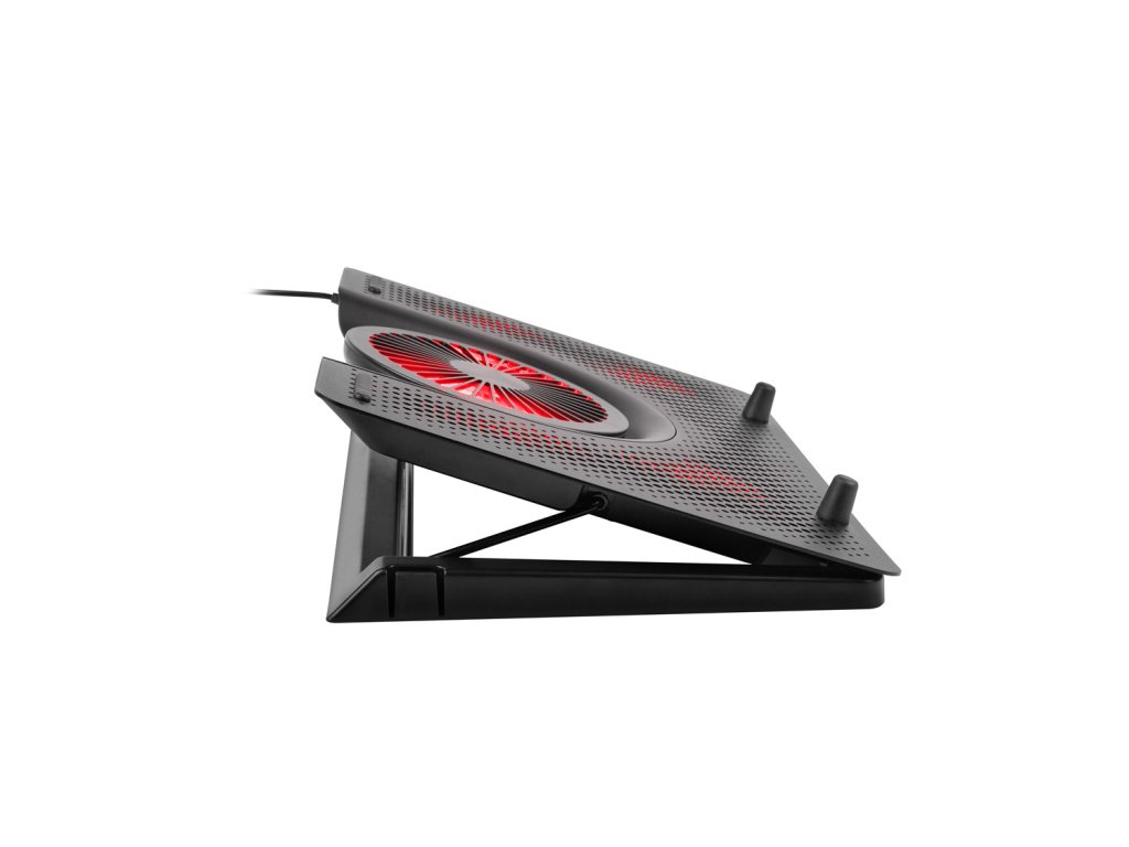 Chladicí systém podložky Oxid 550 je unikátní tím, že jeden velký ventilátor vhání studený vzduch do střední části notebooku a čtyři menší ventilátory umístěny na krajích odsávají teplý vzduch ven, což zajišťuje vynikající cirkulaci a vysokou efektivnost.