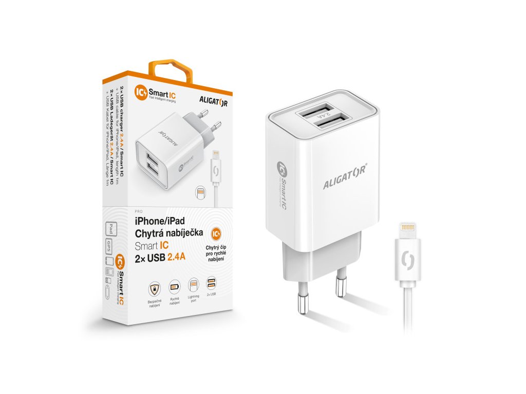 Chytrá síťová nabíječka ALIGATOR 2,4A, 2xUSB, smart IC, bílá, USB kabel pro iPhone/iPad