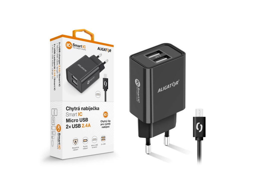 Chytrá síťová nabíječka ALIGATOR 2,4A, 2xUSB, smart IC, černá, micro USB kabel