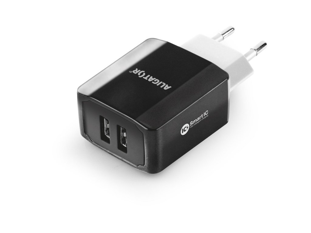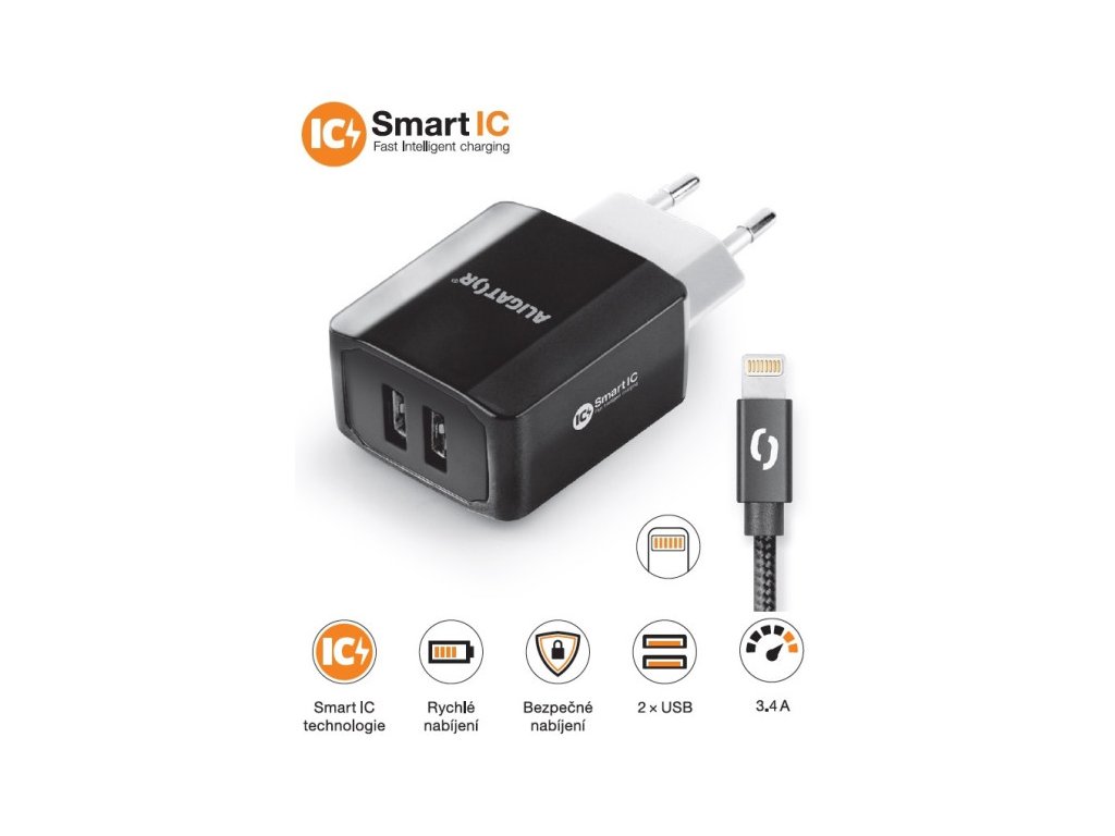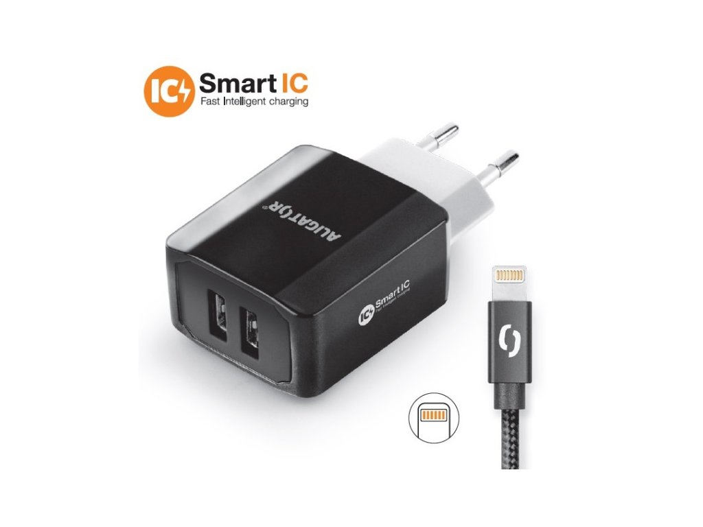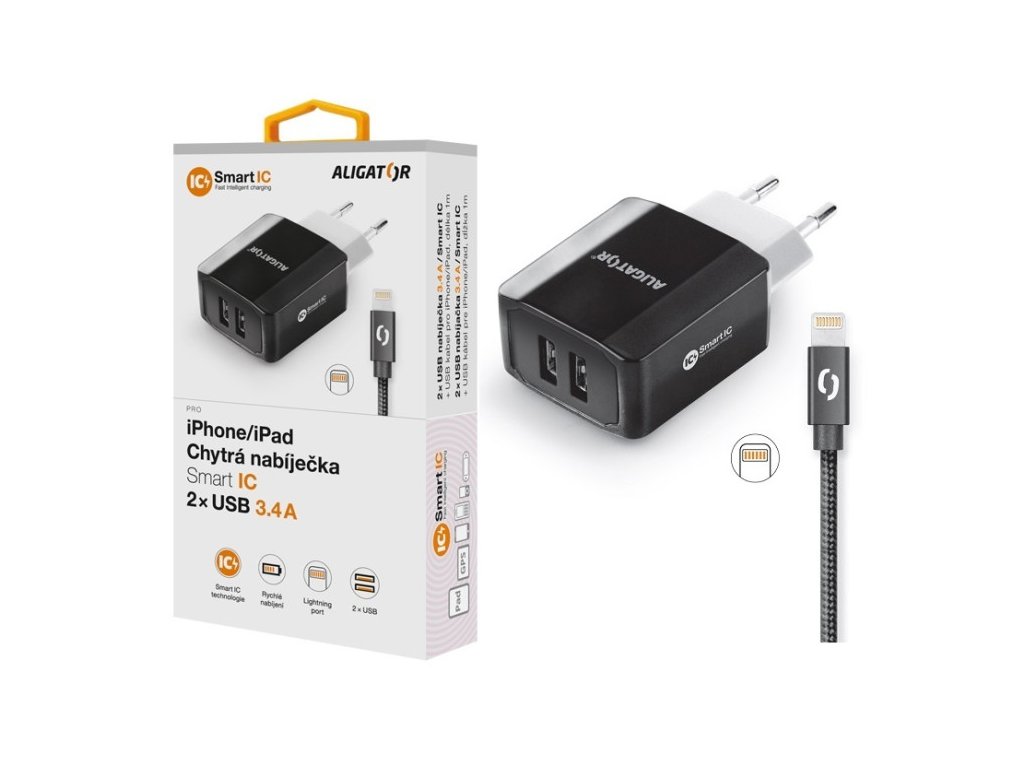 Chytrá síťová nabíječka ALIGATOR 3.4A, 2xUSB, smart IC, černá, kabel pro iPhone/iPad 2A