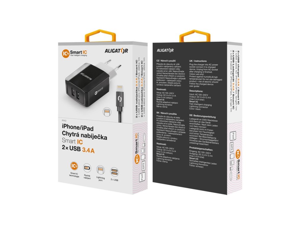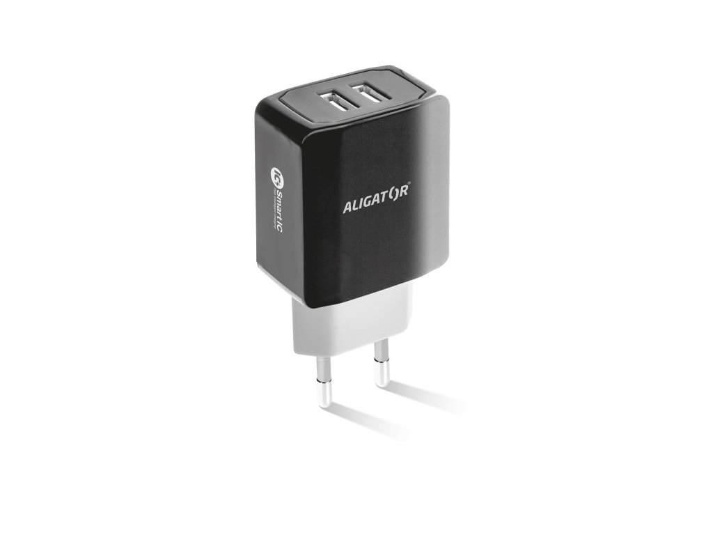 Chytrá síťová nabíječka ALIGATOR 3.4A, 2xUSB, smart IC, černá, kabel pro iPhone/iPad 2ANová výkonná síťová nabíječka řady „SMART IC“ v černém provedení, dvěma USB porty s výstupní kapacitou 3.4A.