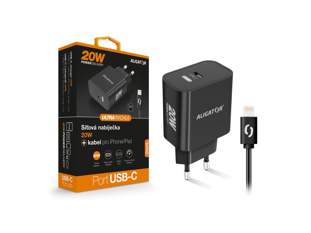 Chytrá síťová nabíječka ALIGATOR Power Delivery 20W, USB-C kabel pro iPhone/iPad, černá
