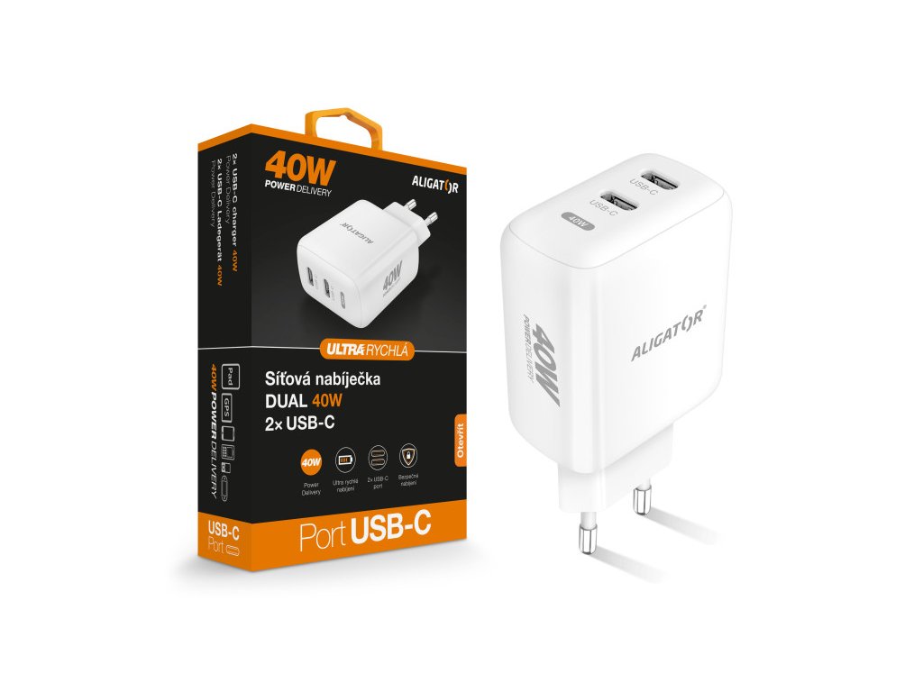 Výkonná a SMARTChytrá síťová nabíječka ALIGATOR Power Delivery 40W, 2xUSB-C