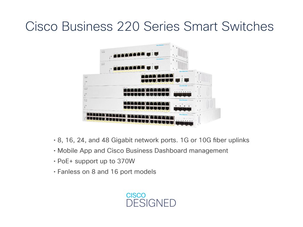 CBS220-8FP-E-2G - Cisco Business 220 Ethernet SwitchŘada Cisco Business 220 jsou cenově dostupné inteligentní přepínače se snadným použitím, zabezpečením a spolehlivostí pro sítě podnikové třídy. Díky intuitivnímu palubnímu panelu, možnostem napájení přes Ethernet (PoE) a přizpůsobitelným funkcím poskytují tyto přepínače spolehlivou obchodní síť v rámci vašich rozpočtových parametrů. Pokud potřebujete síť na špičkové úrovni a cena je nejvyšší prioritou, nabízí řada Cisco Business 220 vynikající řešení.