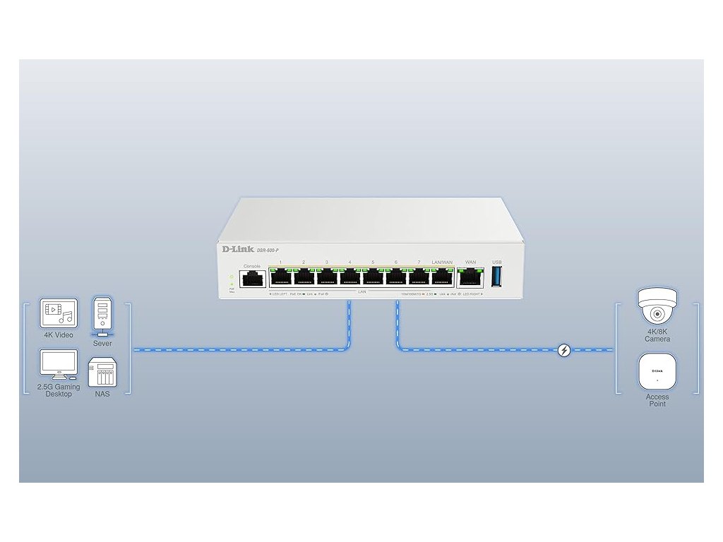 DBR-600-P nabízí vysoce výkonné síťové připojení s 2,5GE WAN portem a osmi 2,5GE PoE porty pro rychlé a spolehlivé připojení.