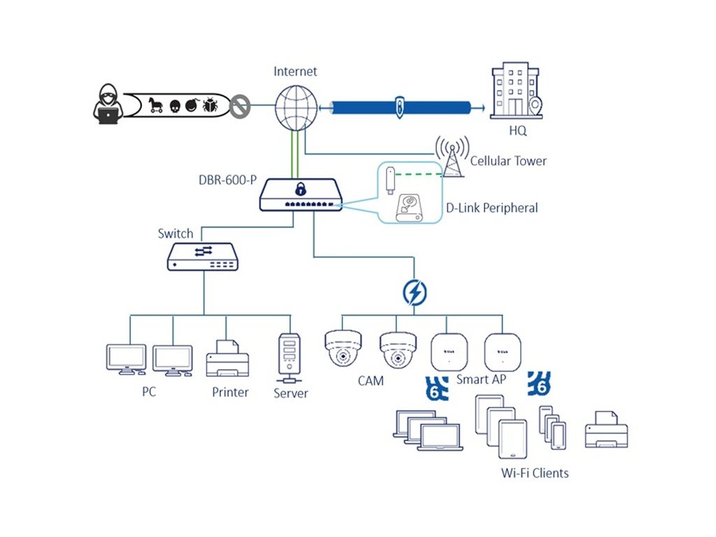 Je ideální pro malé kanceláře a kavárny, obsahuje USB port pro 4G/5G USB modem D-Link, který nabízí flexibilní zálohování internetu. Díky 2Gb/s firewallu a IPsec VPN tunelům zajišťuje bezpečný vzdálený přístup. Integrovaná správa AP a PoE zjednodušuje ovládání bezdrátových přístupových bodů, což z něj činí vynikající volbu pro firmy hledající efektivní a bezpečná síťová řešení.