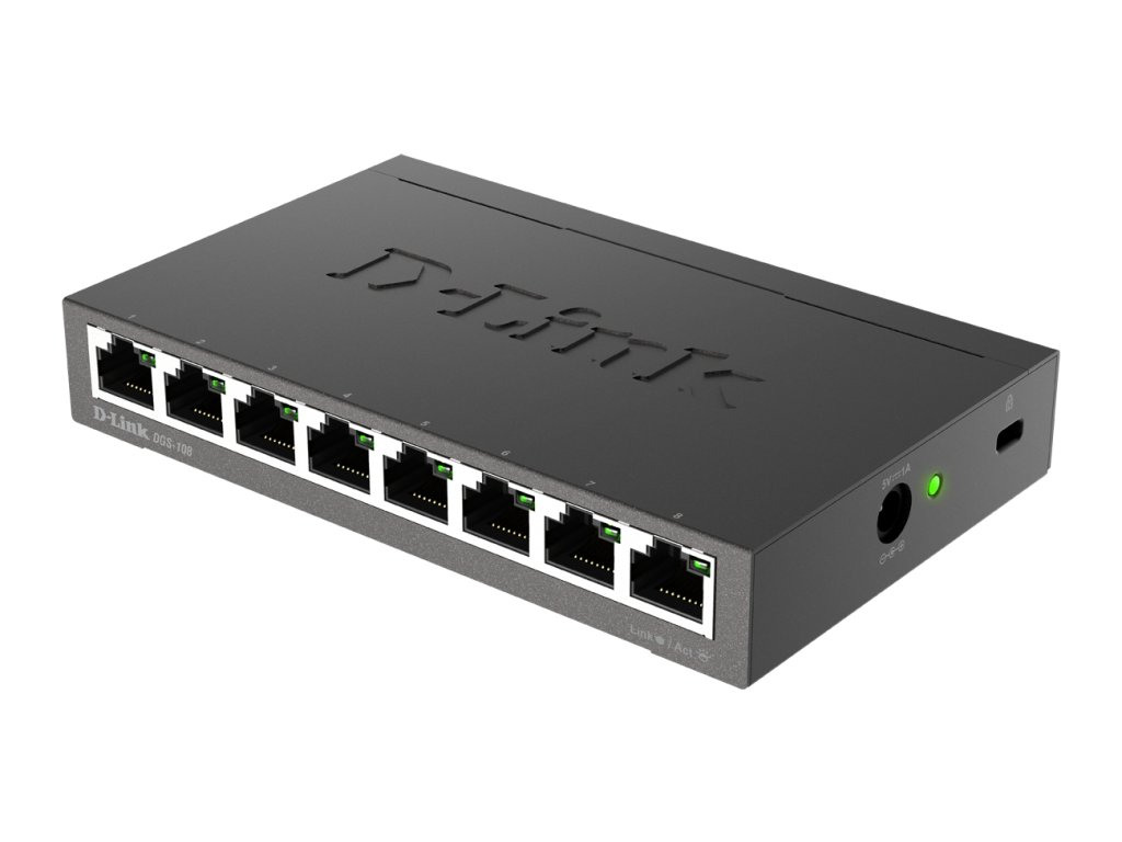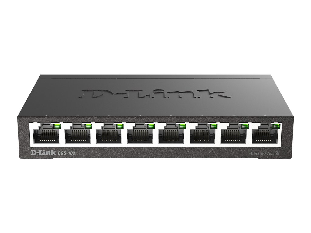 8portový gigabitový neřízený stolní přepínač DGS-108 nabízí ekonomický způsob pro malé a střední podniky a malé a střední podniky, jak těžit ze zvýšené šířky pásma gigabitového Ethernetu. Poskytuje osm gigabitových portů pro snadné rozšíření vaší sítě a rychlý způsob upgradu sítě na gigabitové připojení.