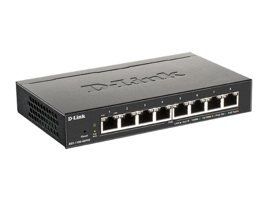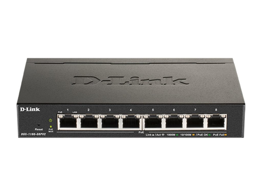 D-Link DGS-1100-08PV2 8-port Gigabit Smart Managed PoE switch, 64WD-Link DGS-1100-08PV2 je 8-portový Gigabit Smart řízený PoE přepínač v kompaktním kovovém provedení bez ventilátorů, pro položení na stůl, na poličku nebo montáž na zeď. Všech 8 portů 10/100/1000M RJ-45 podporuje PoE+ napájení dle 802.3af / 802.3at (max. 30W na port). Celkový PoE výkon přepínače je 64W. Switch nabízí základní sadu L2 funkcí (např. VLAN, QoS, IGMP Snooping, agregace linek) s možností správy z webového rozhraní, pomocí SNMP příkazů nebo nástroje D-Link Network Assistant (DNA). Switch je určený především pro kanceláře (SOHO), malé a střední podniky (SMB) a kamerové systémy (CCTV).