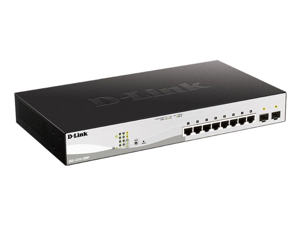 D-Link DGS-1210-10MP je 10-portový PoE+ Gigabit Ehernet L2/L3 Smart Managed switch bez větráků, vhodný pro podnikové sítě (SMB) a kamerové systémy. Je osazený 8 porty 10/100/1000M RJ-45 s podporou napájení 802.3af/802.3at PoE+ (max. 30W) a dvěma 100/1000M SFP sloty s podporou 100M SFP a Gigabit SFP transceiverů. Celkový PoE výkon přepínače je 130W. Napájení přepínače je 230V AC, součástí dodávky jsou držáky pro montáž do 19“ rozvaděče.