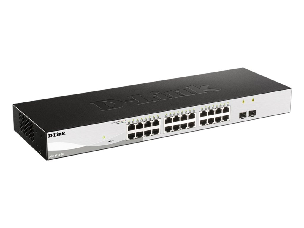 D-Link DGS-1210-26 je výkonný 26-portový Gigabit Ehernet Smart Managed switch bez větráků, vhodný pro přístupové Enterprise sítě a pro SMB. Je osazený 24 porty 10/100/1000M RJ-45 a dvěma 100/1000M SFP sloty s podporou 100M SFP a Gigabit SFP transceiverů. Správa přepínače je z intuitivního webového rozhraní nebo pomocí SNMP příkazů. K dispozici je také bezplatná utilita D-Link Network Assistant (DNA) a centrální NMS plaforma D-View7. Kompaktní sada Telnet CLI příkazů umožňuje základní nastavení přepínače (nastavení IP adresy, hesla, reset, reboot, ping, upgrade FW, nahrání/zálohování konfigurace, show, debug).Kromě pokročilé sady L2 funkcí, VLAN, QoS, AAA, ACL a bezpečnostních funkcí je podporovaný také L3 statický routing (max. 4 IP Interface, 124/50 IPv4/IPv6 záznamů). Funkce Voice VLAN detektuje připojení IP telefonů a přiřazuje je automaticky do samostatné VLANy s vyšší prioritou. Unikátní Surveillance režim umožňuje detekovat ONVIF kompatibilní zařízení (IP kamery, NVR) a automaticky je přiřadit do oddělené video-VLAN a zobrazit topologii sítě ve webovém rozhraní. Výrazně se tak zjednodušuje a urychluje nasazení a správa firemní sítě a IP kamerových systémů.