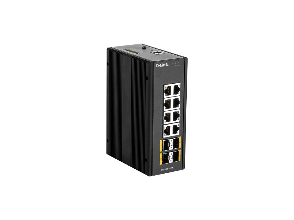 DIS-300G-12PSWPrůmyslový spravovatelný 12-portový Gigabit Ethernet switch, osazený 8 porty 10/100/1000M RJ-45 a 4x 100/1000 SFP sloty pro optický uplink. SFP sloty jsou dvourychlostní, podporují Gigabit SFP a 100M SFP transceivery. Správa přepínače je z webového rozhraní, pomocí SNMP nebo CLI příkazů (sériová konzole, Telnet).