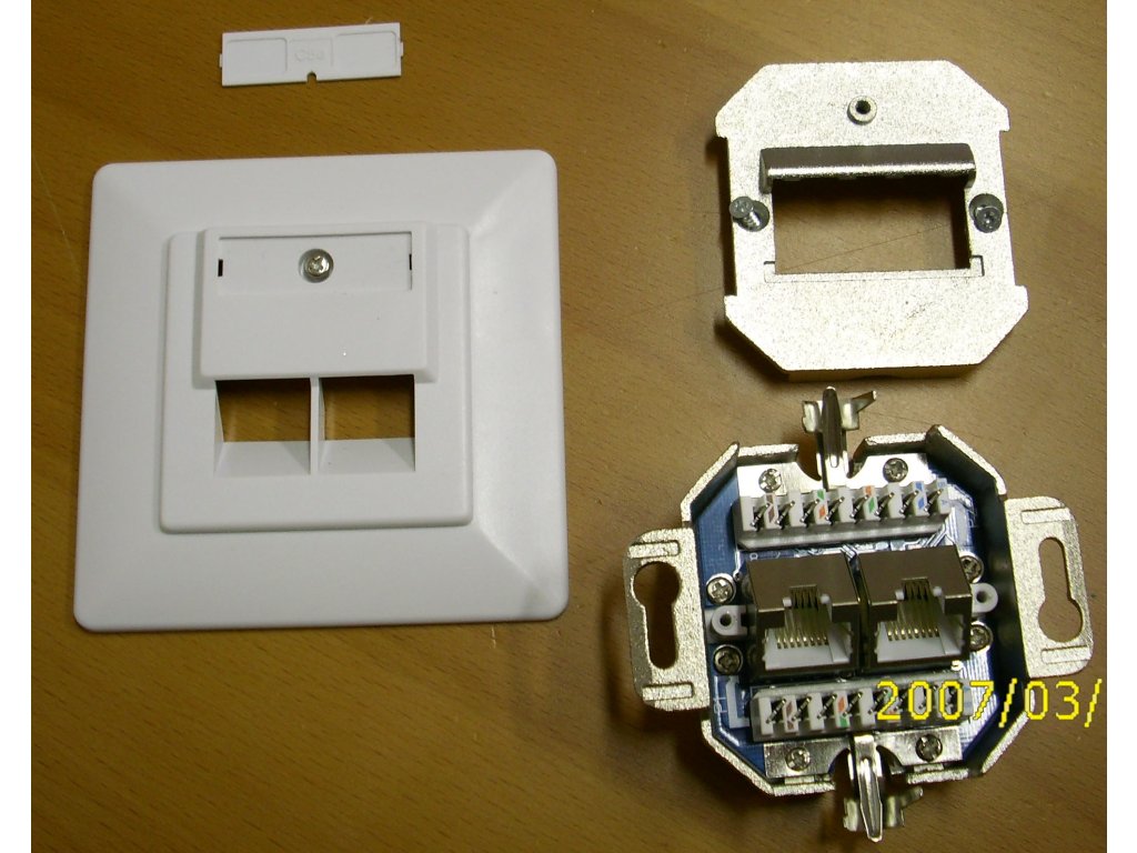 Zásuvka má kovový vnitřek, není samořezná, LSA KroneSTP dvojzásuvka Cat.5e pod omítku 45 st.Cat 5e