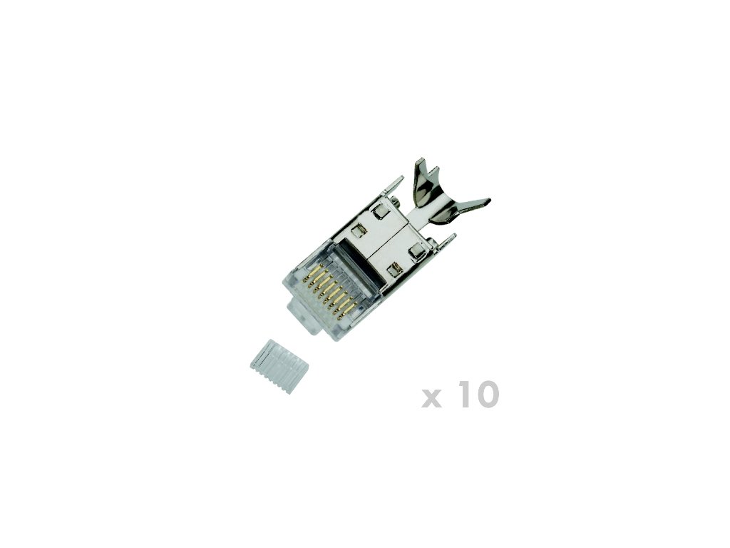 STP stíněný konektor RJ45 (8p8c) pro zakončení kabelů strukturované kabeláže typu drát.Balení obsahuje 10 ks.