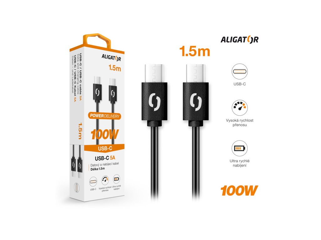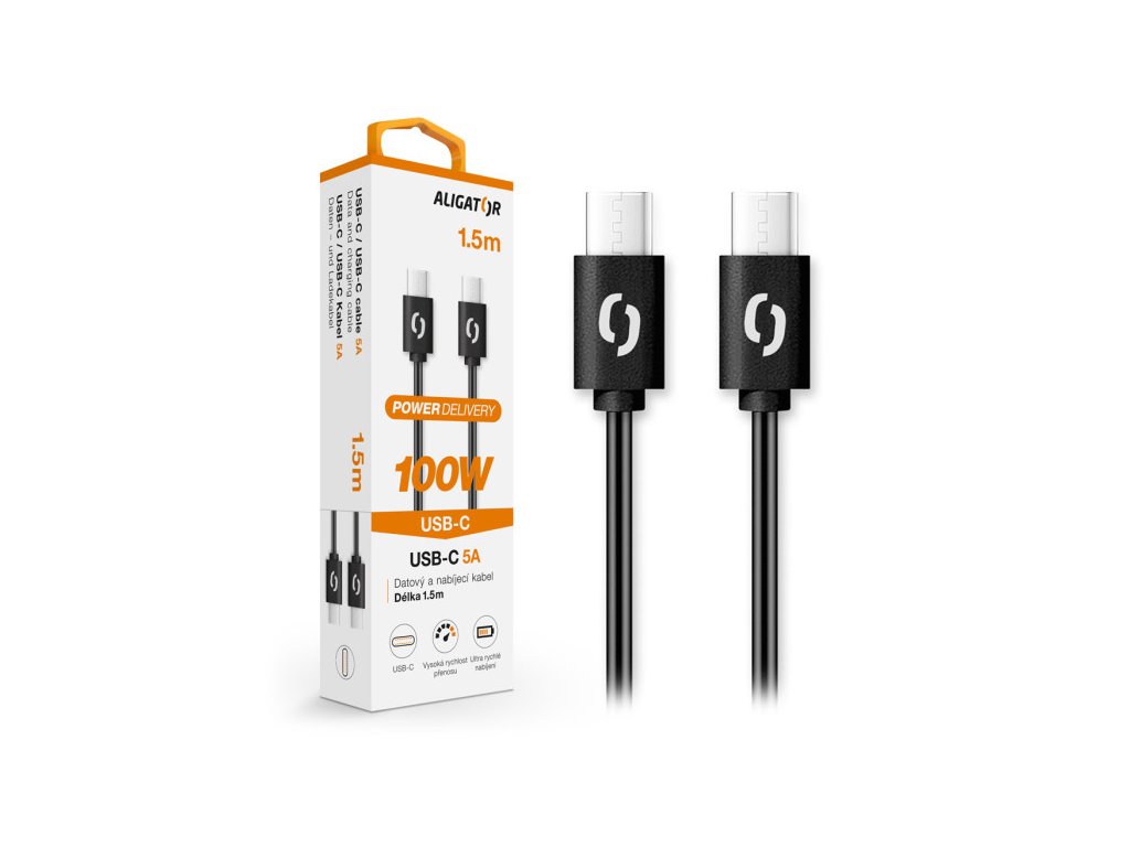 Datový kabel ALIGATOR POWER 100W, USB-C/USB-C 5A, 1,5m černý