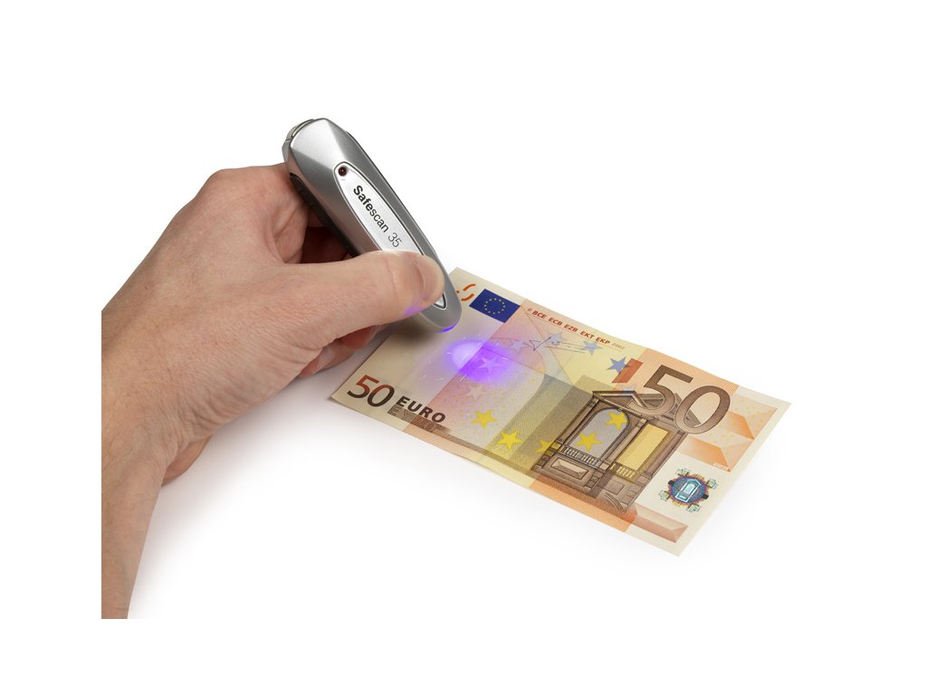 Kompaktní detektor Safescan k ověření pravosti bankovek třemi různými způsoby: UV, magnetické vlastnosti a bezpečnostní proužek.- Kompaktní detektor padělků bankovek Safescan