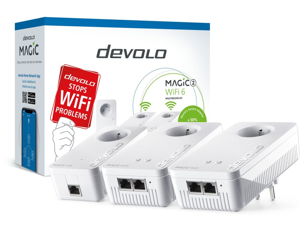 Devolo Magic je spolehlivá domácí síť vedená standardním elektrickým rozvodem. Devolo nabízí jednoduchou alternativu všem složitým kabelovým instalacím, zachovává maximální rychlost až 2400 Mb/s a eliminuje zpomalení nebo výpadky bezdrátové Wi-Fi sítě vlivem rušení. Plynulost při streamingu videa z internetu, hraní online her, využívání aplikací pro virtuální realitu nebo kancelářské práci není tak již závislá na momentálním přetížení bezdrátové komunikace. Adaptéry stačí zapojit do zásuvky v místě, kde je aktuálně umístěné zařízení, které chce uživatel připojit do sítě a inteligentní technologie Plug and Play propojí všechny takto zapojené body do jediného celku. Síťové standardy: IEEE 802.3, IEEE 802.3u, IEEE 802.3ab, IEEE 802.3x, IEEE 802.3az, IEEE 802.11 a, b, g, n, ac, k, r, v (2.4/5 GHz souběžně), IEEE 802.3az, Auto MDI/X, HomeGrid Forum. Přenosová rychlost: Powerline až 2400 Mbit/s, Wi-Fi 1800(mbps,2x2 MIMO/5 GHz) Wi-Fi 574(mbps,2x2 MIMO/2,4GHz). Dosah: až 500m, Wi-Fi 300m, Mesh Wi-Fi. Modulace: Powerline OFDM - 4096/1024/256/64-QAM, QPSK, BPSK, Wi-Fi DSSS (IEEE 802.11b), Wi-Fi OFDM (IEEE 802.11a, g, n, ac, ax). Zabezpečení: WPA/WPA2,WPS PIN, WPS PBC, Wi-Fi Time Schedule, 128 Bit AES. Rozhraní: 2 x Ethernet RJ45, 2x2 for 2,4 + 5 GHz souběh/ 4 x AntenaDodatočné parametre