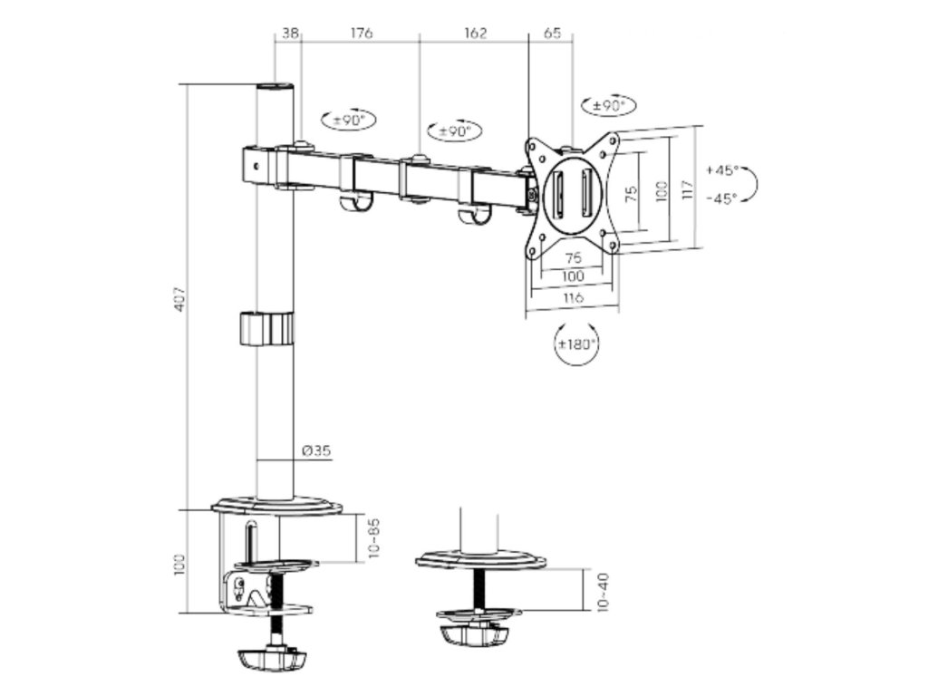 • Snadná instalace: Držák je dodávám s kompletním montážním příslušenstvím, díky němuž je možné ho snadno namontovat na stůl během několika minut. Snadná montáž pomocí svorky na desky o tloušťce 10-85 mm nebo pomocí průchodky na desky o tloušťce 10-40 mm.
