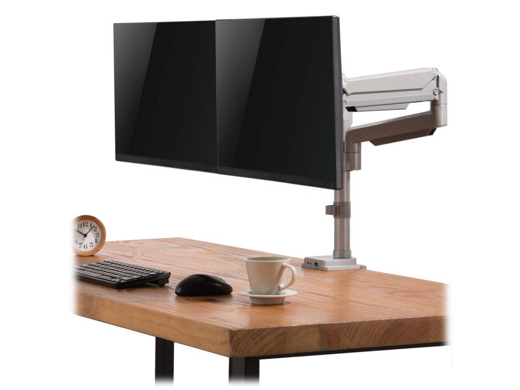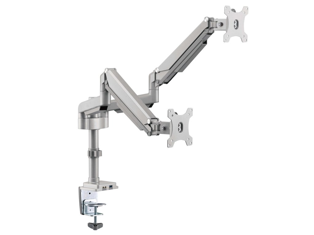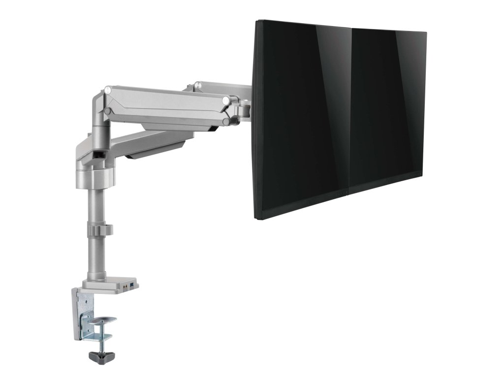 Držák s plynovým ramenem se dvěma displeji pro 13” až 34” monitory – svorka nebo průchodka, USB, audio porty