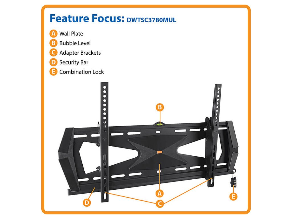 Silný bezpečnostní nástěnný držák s nakloněním pro 37" až 80" TV a monitory, ploché nebo zakřivené obrazovky, UL CertifiedBezpečnostní nástěnný držák s kombinovaným zámkem připevní vaši televizi nebo monitor s plochou obrazovkou nebo zakřivenou obrazovkou na stěnu.