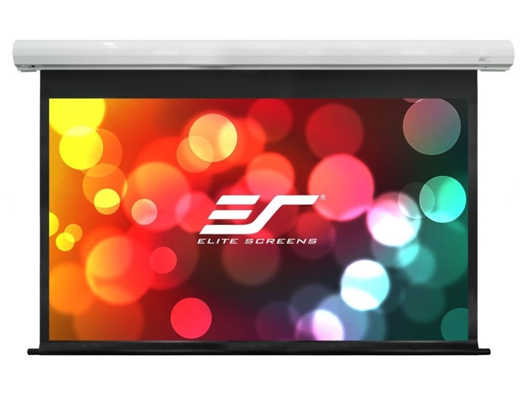 Elite Screens SK180NXW2-E6Elektrické motorové plátno s úhlopříčkou 180" a bílou konstrukcí. Plátno má zvýšený vrchní černý okraj 6" (cca. 15 cm).