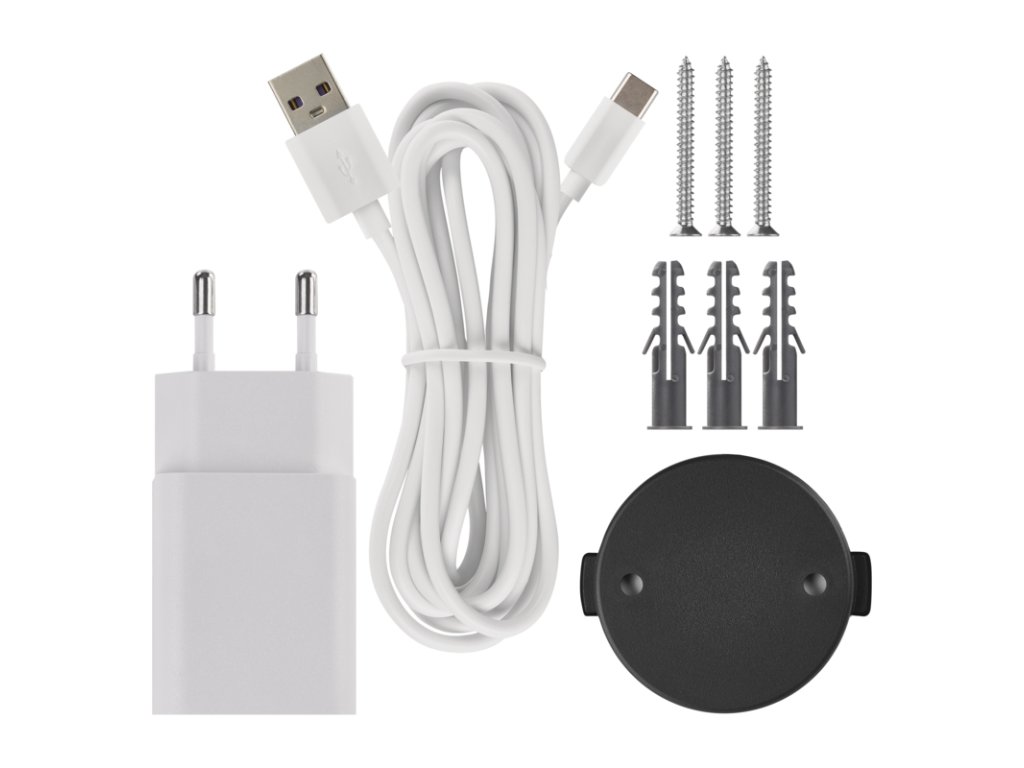 obsah balení 1× kamera, 1× napájecí adaptér, 1× USB kabel, 1× držák, 1× adhesivní páska, 1× šroubky, 1× manuál