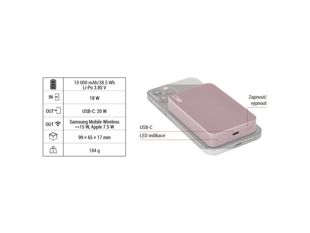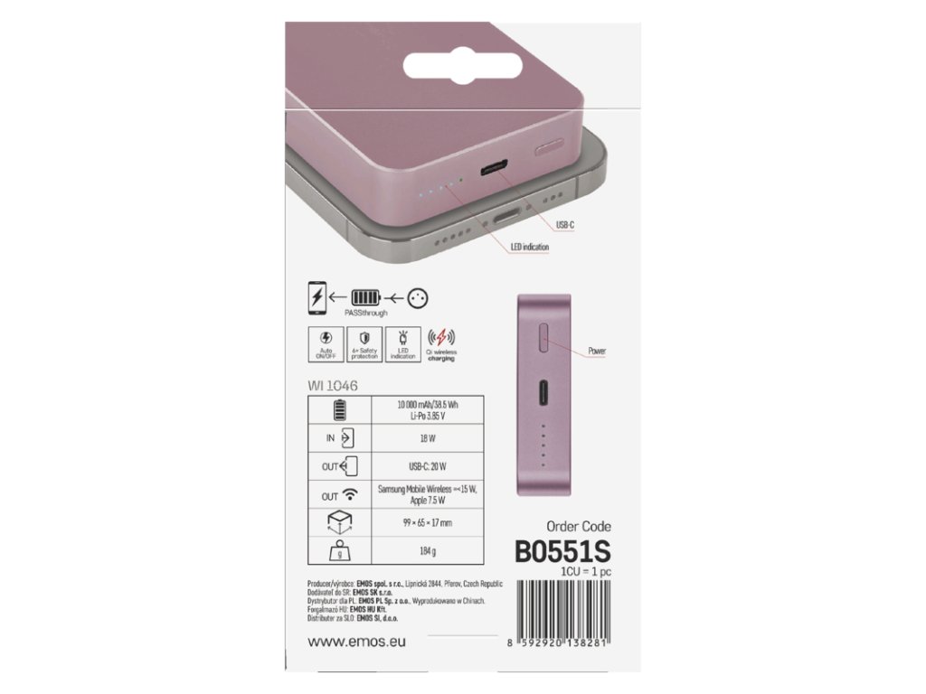 EMOS POWERBANKA WI1046, bezdrátové nabíjení 20W, 10.000mAh, LOSOSOVÁ, 1xUSB-C