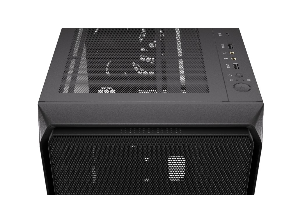 Přední I/O panel: 1× USB-C 3.2 Gen 2 (10 Gb/s), 2× USB-A 3.2 Gen 1 (5 Gb/s), 1× jack 3,5 mm (sluchátka), 1× jack 3,5 mm (mikrofon), 1× tlačítko POWER, 1× tlačítko RESET