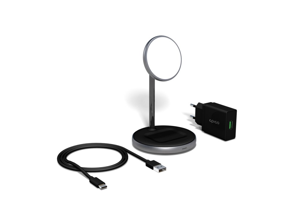 Epico 2in1 Magnetic Wireless Charger je magnetický stojan, který kombinuje funkci duálního bezdrátového nabíjení s prémiovým designem. Je kompatibilní s MagSafe a nabízí silné magnetické uchycení pro nepřerušované nabíjení. Dokáže nabíjet váš smartphone maximálním výkonem 15W (7,5W pro iPhone) a vaše AirPods výkonem až 5W. Slouží také jako praktický stojánek pro iPhone, který vám umožní sledovat videa nebo telefonovat v preferovaném úhlu. Díky LED indikátoru můžete kontrolovat stav nabíjení. Součástí balení je USB-C kabel a 18W QC síťový adaptér.Vstupní napětí/proud: 5 V/2,4 A, 9 V/2,4 A, 12 V/2,4 A, Bezdrátový výstup 1: 15 W/10 W/7,5 W, Bezdrátový výstup 2: 3 W, Celkový bezdrátový výkon: 18 W, Materiál: ABS, PC, slitina železa, Rozměry: 92×151×92 mm, Hmotnost: 241 g