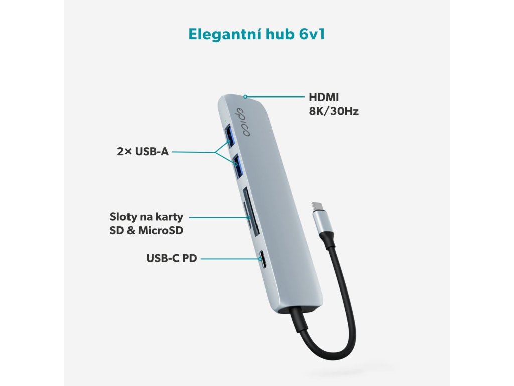 Výkonný hub s podporou až 8KEpico 6in1 Aluminium Hub přináší elegantní řešení pro každodenní práci i multimediální využití. Díky šesti základním portům – HDMI, USB-C Power Delivery, dvěma USB-A a slotům na SD i MicroSD karty – získáte spolehlivé připojení pro všechna svá zařízení. HDMI port podporuje rozlišení až 8K/30Hz nebo 4K/120Hz, takže využijete plný potenciál monitorů s vysokým rozlišením. Hub navíc prostřednictvím HDMI portu zajišťuje precizní podání dynamického obrazu a zvuku díky technologii Dynamic HDR+ s až 12bitovou barevnou hloubkou a multikanálovým zvukem, včetně Dolby Atmos a DTS:X.