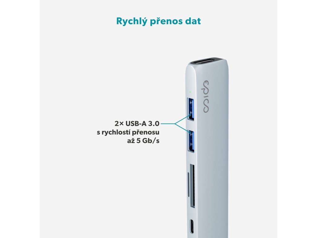 Průchozí nabíjení s výkonem až 100 W zaručuje, že váš notebook zůstane napájený i při maximálním zatížení. USB-A porty umožňují přenos dat rychlostí až 5 Gb/s, zatímco sloty na SD a MicroSD karty dosahují rychlosti až 104 Mb/s – ideální pro rychlé přesouvání a kopírování souborů. Hliníkové tělo zajišťuje prémiový vzhled, odolnost a efektivní odvod tepla, takže se na hub můžete spolehnout i při dlouhodobém používání.